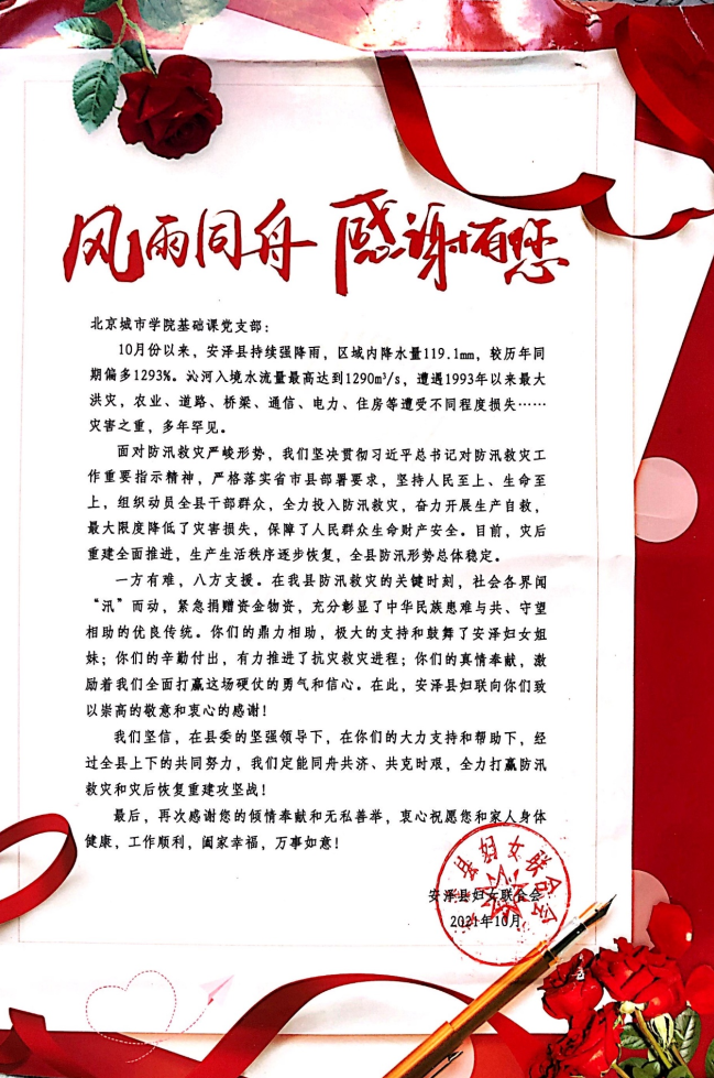日前,黨支部收到了安澤縣婦聯寄來的捐贈證書和感謝信。本次活動得到了支部黨員教師的大力支持,不僅表達了北城人心系災區群眾的大愛,更加強了基礎課黨支部的向心力和凝聚力。