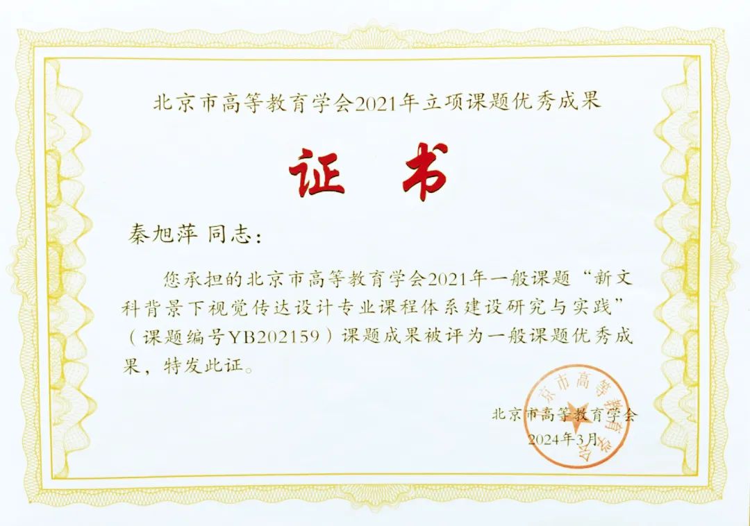 藝術(shù)設(shè)計(jì)學(xué)部教師高度重視課程建設(shè)與理論研究的結(jié)合,以上獲獎(jiǎng)成果充分體現(xiàn)了學(xué)部教師的團(tuán)隊(duì)協(xié)作精神與學(xué)術(shù)科研能力。北京市高等教育學(xué)會(huì)是由北京的高等學(xué)校和北京市高等教育行政管理部門(mén)聯(lián)合發(fā)起成立,從事高等教育科學(xué)研究的群眾性學(xué)術(shù)團(tuán)體。我校為學(xué)會(huì)副理事長(zhǎng)單位,長(zhǎng)期積極參與學(xué)會(huì)各項(xiàng)科研及社會(huì)工作。