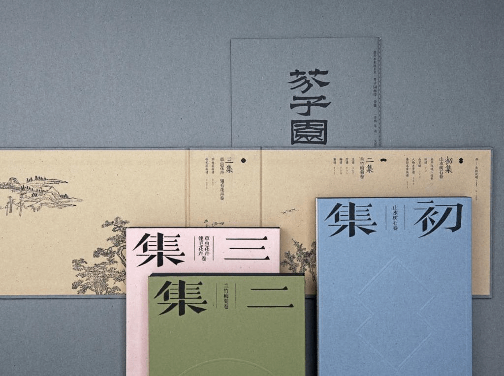 其中《芥子園畫傳·全集》是老書新作,為田老師近兩年的代表作品,這是一套經典的明清繪畫秘笈,是初學者學畫的工具書。在介紹這本書之前,他帶了一本市面上舊版芥子園畫集,通過對比我們可以看到設計師的巧妙構思。田老師強調“設計應該有當代的審美性與現代的元素”,我們可以很明顯的看到,與舊版不同的是,新封面使用了大量的留白手法,去裝飾化,簡潔直觀的呈現了整本書的設計。全集分為初集、二集、三集,內容包括“山水樹石”“蘭竹梅菊〞蟲草花卉〞翎毛花卉“四個部分,在三本書的封面采用壓印的工藝復刻了三個符號化元素:方勝形、扇面形、花卉形,這是從“花窗漏影、借景成畫"的視角去解讀繪畫從而提煉的元素。憑借精美的裝幀設計、創意的設計理念,獲得眾多大獎——2022年度“最美的書”、紐約TDC獎、第34屆香港印制大獎銀獎、第十屆全國書籍設計藝術展獎項。他認為沒有一項設計工作能夠脫離書籍自身的文本以及框架的束縛,強調了書籍的內文版式要與外在形態達到和諧統一。