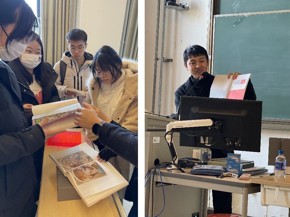 講座伊始,田老師對“7x3”主題進行了闡釋:“‘7x3’,‘7’是7本書,‘3’則是書籍裝幀設計的三個維度——‘概念編輯設計’、‘編排設計’與‘裝幀設計’?!?他認為書籍設計是一個整體,在設計中應該做到書籍內容與設計的統一。同時,田老師為同學們帶來了實物的7本書,方便師生們現場觸摸與感受紙張與印刷的魅力。