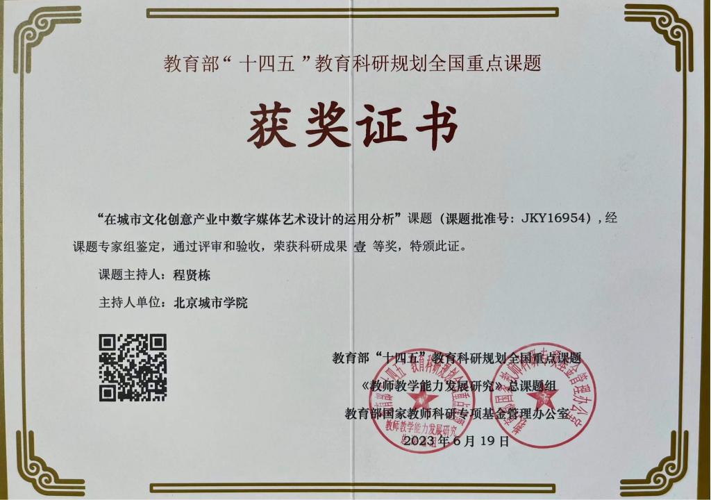 近日,藝術設計學部數字媒體藝術專業程賢棟老師參與的“十四五”教育科研規劃全國重點項目順利結題。課題“在城市文化創意產業中數字媒體藝術設計的運用分析”取得卓越成果,榮獲科研成果一等獎,并被中國期刊網收錄。