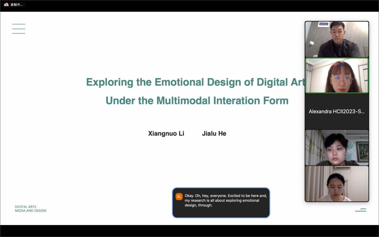 藝術(shù)設(shè)計(jì)學(xué)部數(shù)字媒體教研室教師劉碩,作為此次分論壇主席,帶領(lǐng)四位老師及學(xué)生參加線上會(huì)議。分別做了《VR游戲的虛假烏托邦:VR游戲下的身心》;《探索多模態(tài)交互在數(shù)字藝術(shù)中的情感化設(shè)計(jì)》;《數(shù)字時(shí)代漆藝展示設(shè)計(jì)研究》;《iPlay:邁向社區(qū)設(shè)計(jì)的社交媒體》;《VPlaytime: 虛擬現(xiàn)實(shí)教室的面對(duì)面課間》五個(gè)專題發(fā)言。并發(fā)表論文,論文交由著名的施普林格出版社出版。藝術(shù)設(shè)計(jì)學(xué)部師生提供的5篇論文均已被大會(huì)收錄出版。