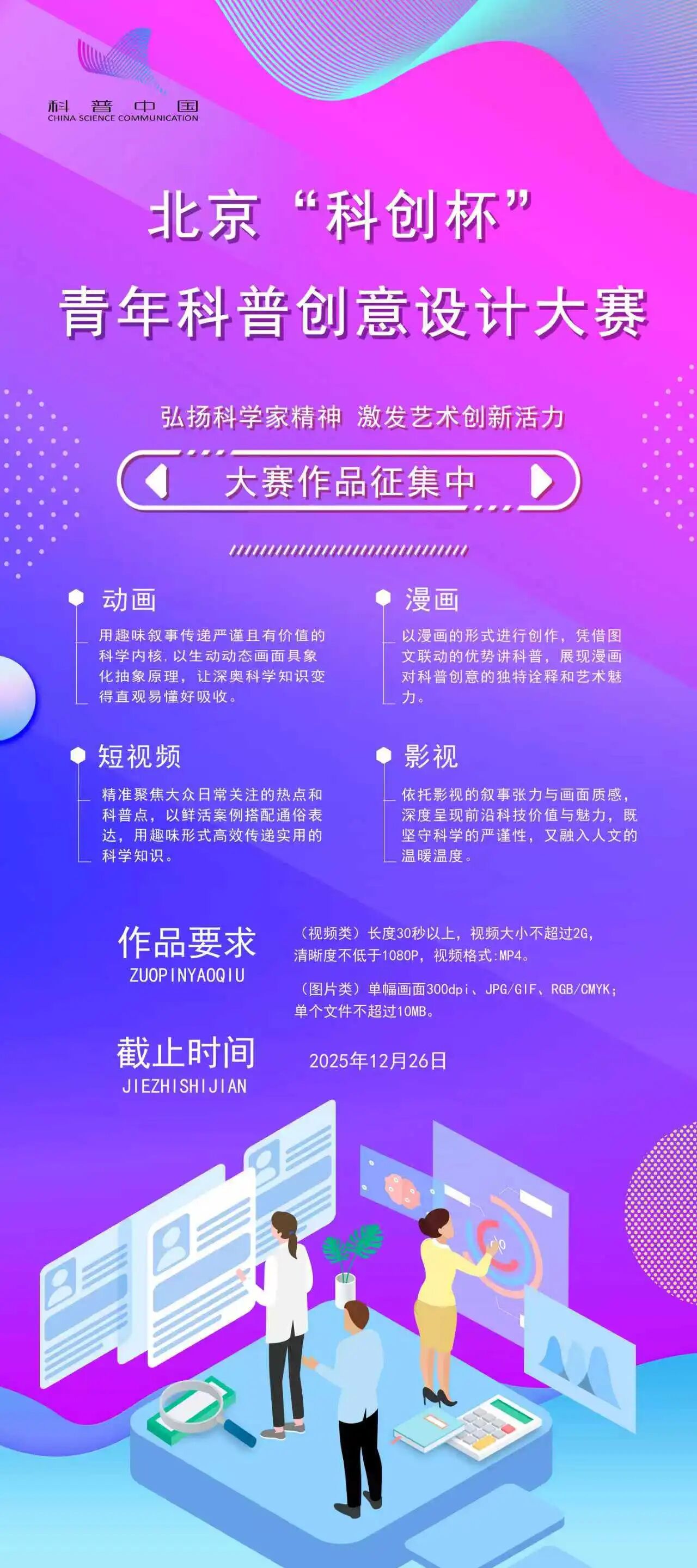 為貫徹黨的二十大精神,落實《北京市“十四五”時期教育改革和發展規劃(2021—2025年)》和《北京市全民科學素質行動規劃綱要(2021—2035年)》的部署和要求,促進區域均衡發展,北京城市學院與北京創意設計協會聯合舉辦北京“科創杯”青年科普創意設計大賽(以下簡稱大賽),以“弘揚科學家精神 激發藝術創新活力”為主題,在全社會傳播科學知識,講述科學故事,大力弘揚科學家精神,營造尊重科學、崇尚創新的社會環境,促進北京地區學生核心素養均衡發展。大賽征集科普類漫畫、動畫、短視頻等藝術設計作品,采用線上申報、線下評審和線下展覽、展映相結合的方式進行。大賽由北京市科學技術協會主辦,北京城市學院科協承辦,北京城市學院藝術設計學部、北京創意設計協會聯合組織實施,面向北京地區高校師生及社會人員征集參賽。