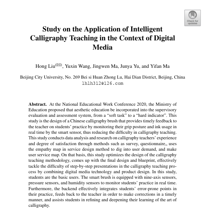 發表論文:2022年7月 在Design Thinking and Practice in Contemporary and Emerging Technologies發表論文Study on the Application of Intelligent Calligraphy Teaching in the Context of Digital Media