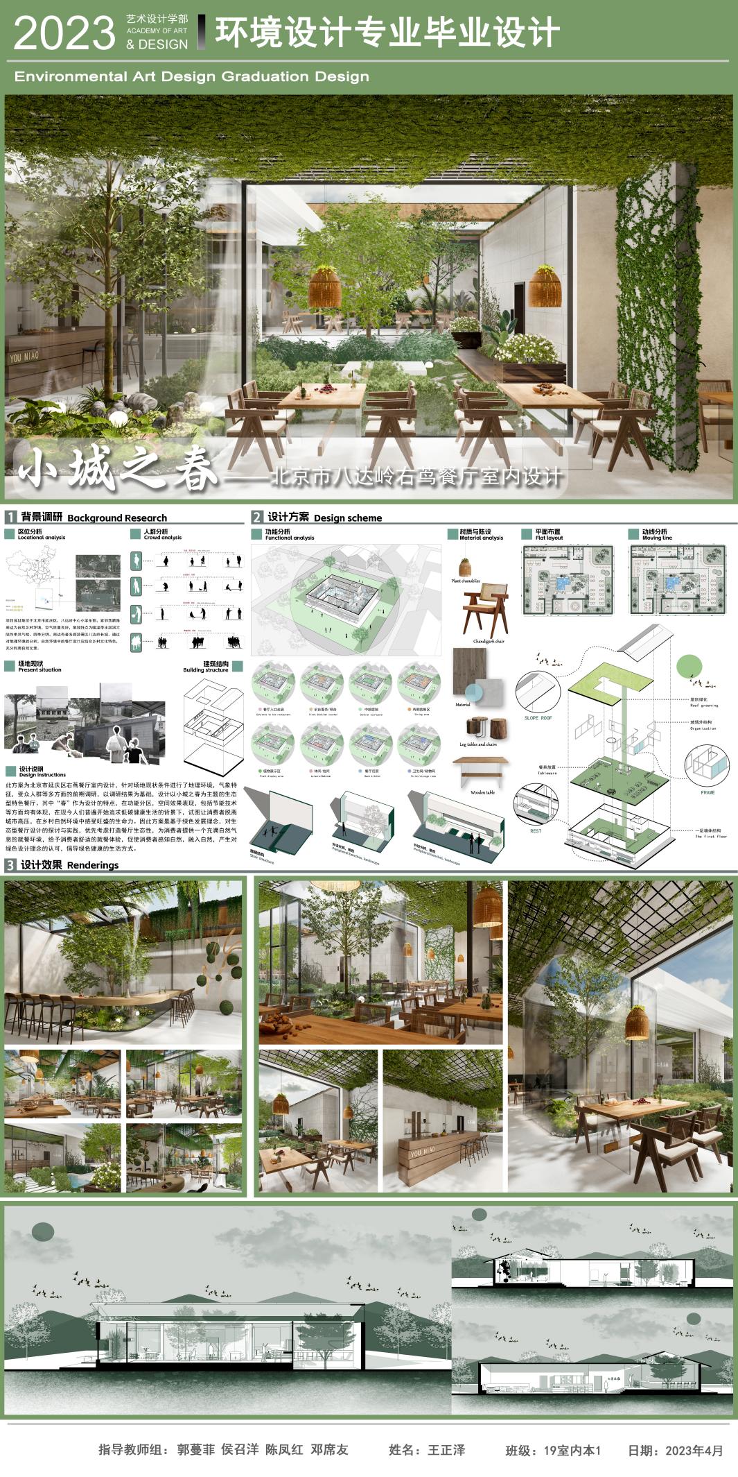 此方案為北京市延慶區右蔦餐廳室內設計,針對場地現狀條件進行了地理環境,氣象特征,受眾人群等多方面的前期調研,以調研結果為基礎,設計以小城之春為主題的生態型特色餐廳。其中“春”作為設計的特點,在功能分區,空間效果表現,包括節能技術等方面均有體現,在現今人們普遍開始追求低碳健康生活的背景下,試圖讓消費者脫離城市高壓,在鄉村自然環境中感受旺盛的生命力。因此方案是基于綠色發展理念,對生態型餐廳設計的探討與實踐,優先考慮打造餐廳生態性,為消費者提供一個充滿自然氣息的就餐環境,給予消費者舒適的就餐體驗,促使消費者感知自然,融入自然,產生對綠色設計理念的認可,倡導綠色健康的生活方式。
