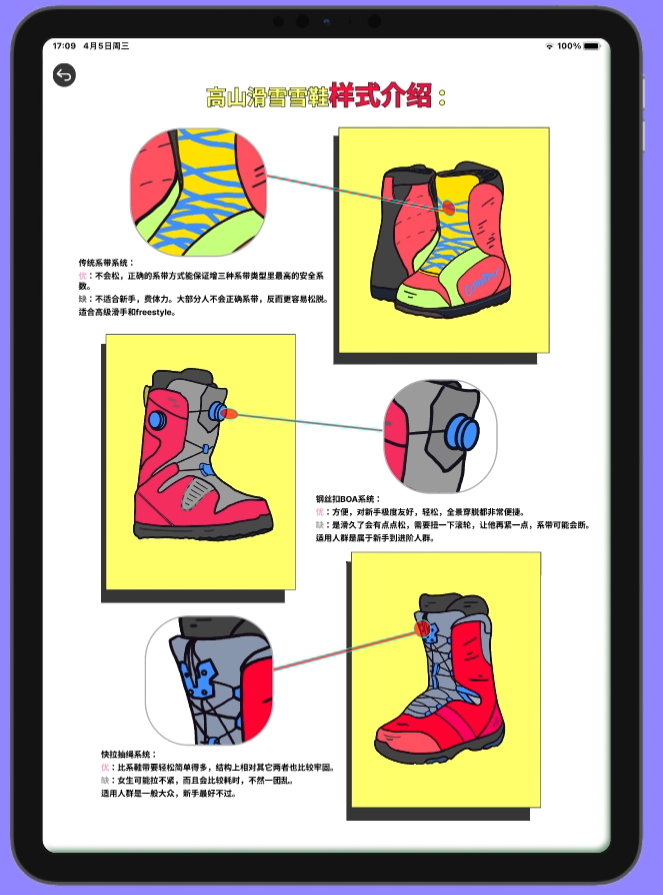 作者打造了一款有關(guān)高山滑雪的信息可視化應(yīng)用設(shè)計(jì),其目的是為了拓寬高山滑雪的普及面,讓更多的年輕人了解高山滑雪的規(guī)則,熱愛高山滑雪。本次的畢業(yè)設(shè)計(jì)《冬奧之高山滑雪信息可視化應(yīng)用設(shè)計(jì)》筆者以可視化的方式去呈現(xiàn)冬奧賽場(chǎng)上高山滑雪的基本規(guī)則和裝備細(xì)節(jié)。比賽規(guī)則主要包含兩大類:速度類項(xiàng)目、競(jìng)技類項(xiàng)目。裝備細(xì)節(jié)主要包含雪鏡、雪鞋、雪杖、雪板如何選擇的科普,以上內(nèi)容都有助于新手在雪場(chǎng)更好地進(jìn)行實(shí)踐。創(chuàng)作過程中,筆者將以插畫形式進(jìn)行視覺上的呈現(xiàn),手繪以上提及的所有內(nèi)容,其次借助交互動(dòng)效、可視化圖表、來豐富的視覺效果。