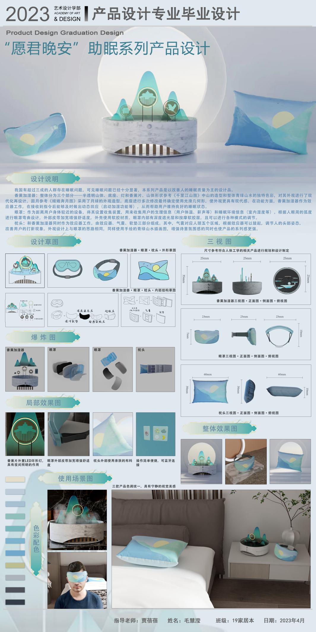 我國有超過三成的人群存在睡眠問題,可見睡眠問題已經十分顯著,本系列產品是以改善人的睡眠質量為主的設計品。香薰加濕器:整體分為三個部分——半透明山體、底座、燈和香薰片。山體形狀參考《千里江山圖》中山的造型和整體青綠山水的獨特色彩,對其外觀進行了現代化再設計。圓月參考 《嫦娥奔月圖》采用了月球的外觀造型。底座進行多次修改最終確定使用光滑幾何形,使外觀更具有現代感。在功能方面,香薰加濕器作為效應器工作,在接收到指令后能夠及時做出動態回應(啟動加濕功能等),從而幫助用戶維持良好的睡眠狀態。眼罩:作為距離用戶身體較近的設備,將其設置收集裝置,用來收集用戶的生理信息(用戶體溫、鼾聲等)和睡眠環境信息(室內濕度等)。根據人眼周的弧度進行眼罩彎曲設計,外部皮帶加寬增強舒適度,外殼使用軟膠材質。眼罩內部有深度遮光層和按摩軟膠層,且可以進行各種模式的調節。枕頭和香薰加濕器同時作為效應器工作。由效應器、氣囊、軟墊三部分組成。其中,氣囊對應人頸五個區域,根據效應器可以鼓起,調節人的頭部姿態,改善用戶的打鼾現象。外觀設計上與眼罩的思路相同,同樣使用手繪的青綠山水插畫圖,增強詩意氛圍感的同時也使產品的系列感更強。