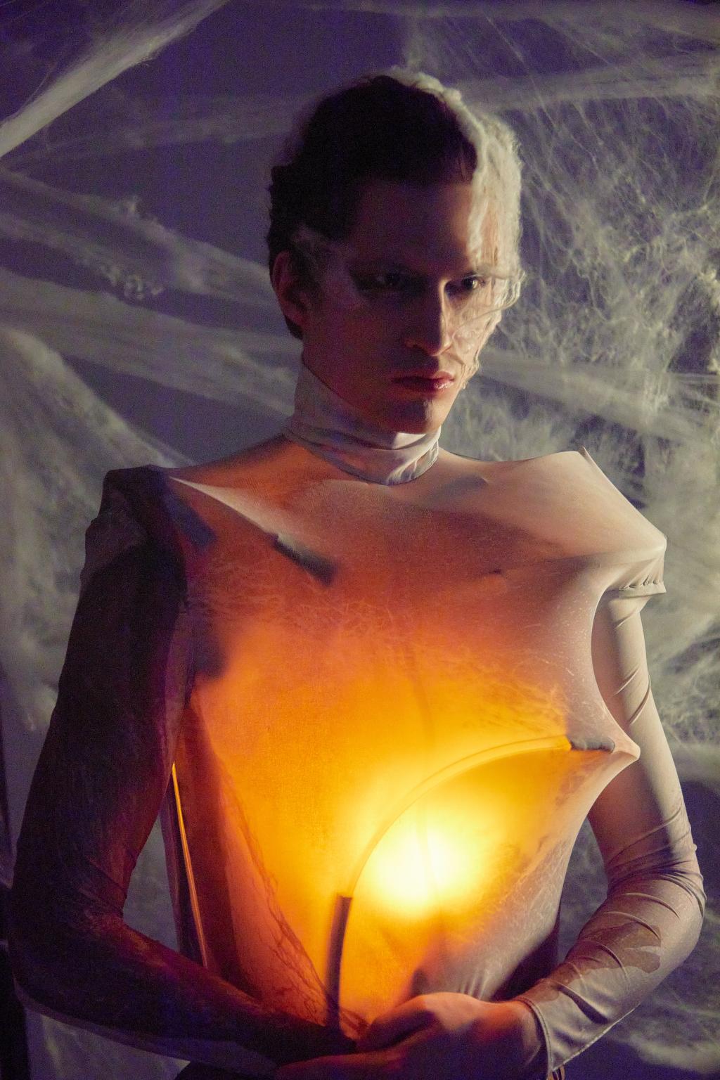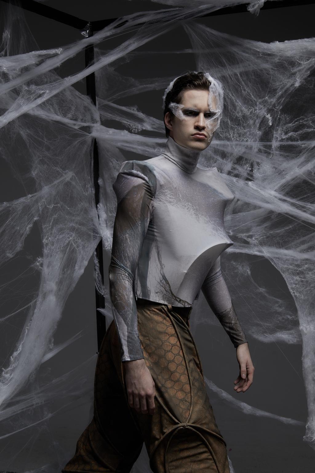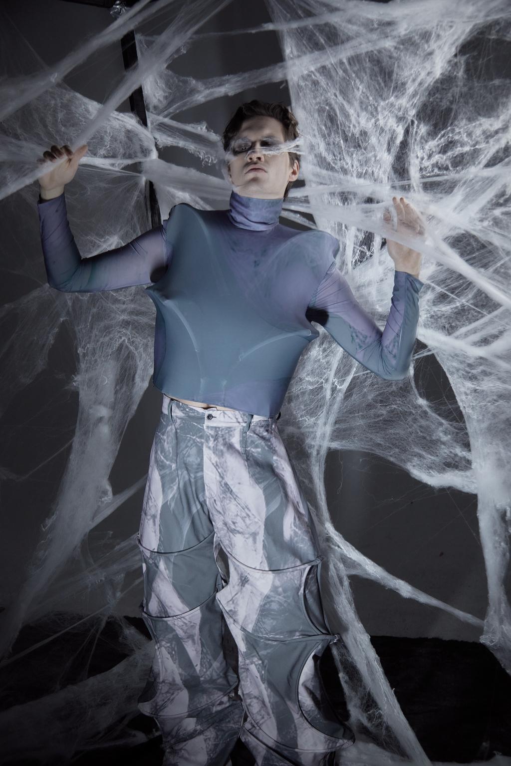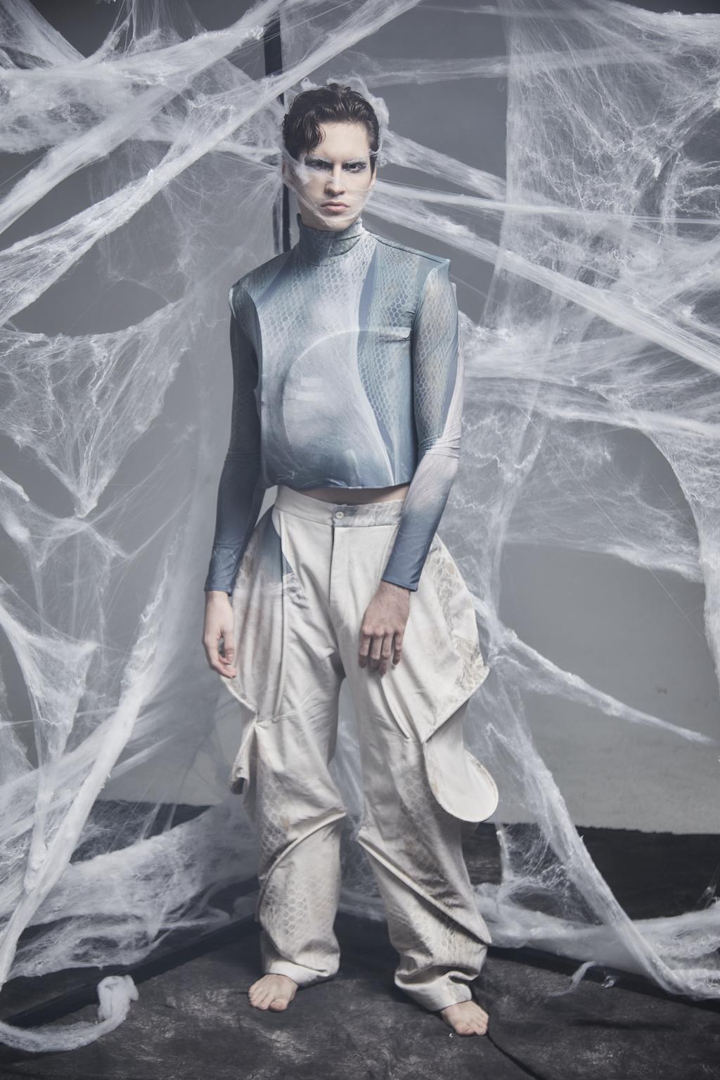 蠶和石蠶,這兩種昆蟲具有不同筑巢方式,通過這兩種不同的生物給我?guī)砹岁P(guān)于服裝輪廓和印花的靈感。在服裝設(shè)計中,我通過這兩點靈感對服裝進行設(shè)計,大膽將生物建筑與服裝設(shè)計結(jié)合。