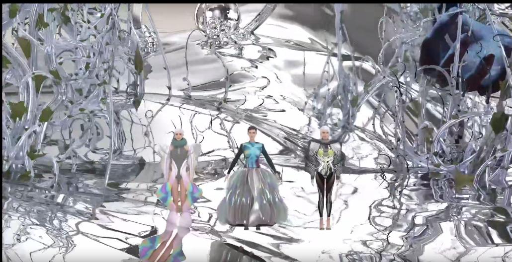 我運用仿生水母與金屬異形的廓形結(jié)合來體現(xiàn)未來世界的美輪美奐。三款設(shè)計分別運用3D打印技術(shù)、數(shù)碼印花與熱成像技術(shù),整體服裝呈現(xiàn)出一種五彩斑斕的效果,既強調(diào)在風格上發(fā)揚個性,又盡力探索未來主義風格的服裝形式。