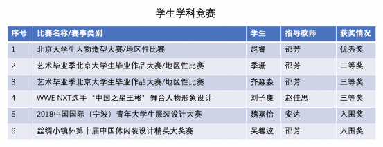 學科競賽:北京大學生人物造型大賽賽前準備、全國藝術畢業季畢業作品大賽賽前準備、WWE NXT選手“中國之星王彬”舞臺人物形象設計比賽賽前準備、絲綢小鎮杯第十屆中國休閑裝設計精英大獎賽賽前準備、2018中國國際(寧波)青年大學生服裝設計大賽賽前準備,教師參加學科競賽國內獲獎8項、國際獲獎7項。