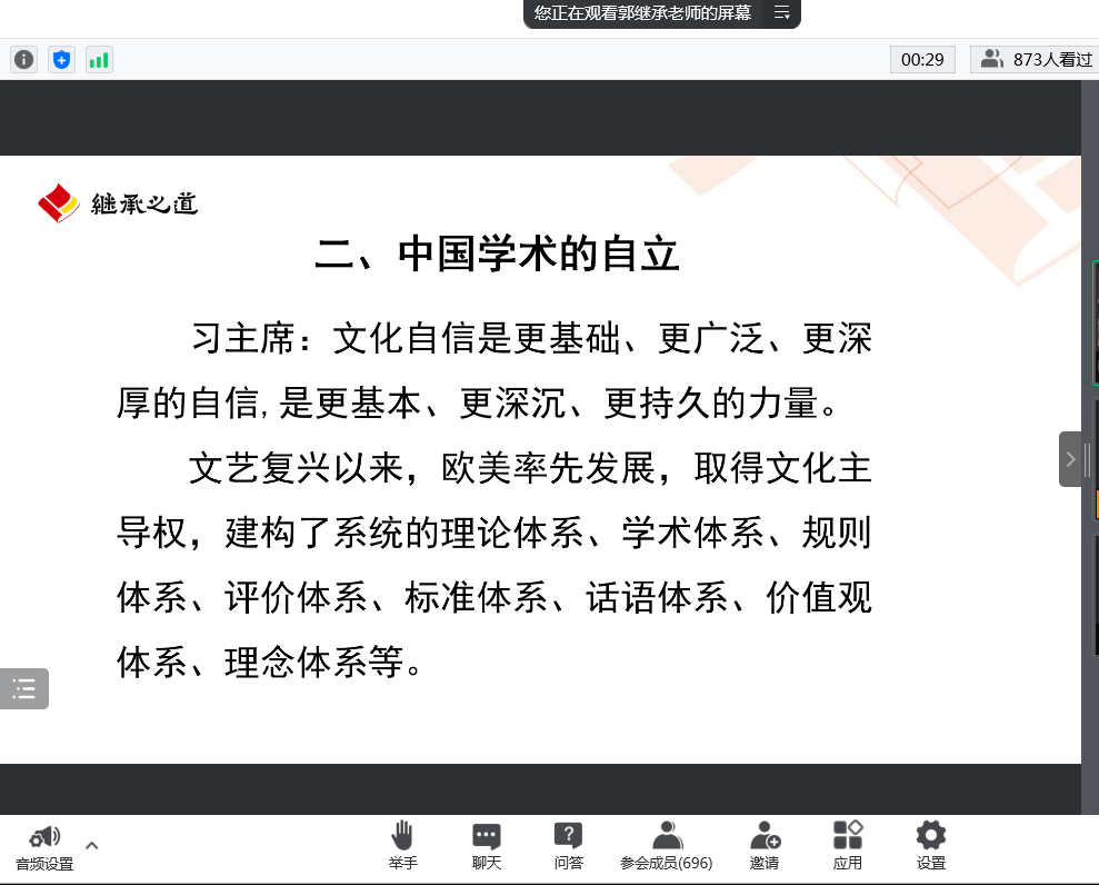 發布者:支部全體黨員教師參加 “堅定文化自信,增強做中國人的底氣和骨氣”專題報告會 時間:2023-05-31 17:46:18 瀏覽:2022年6月24日,學校聯合市社科院(市委講師團),邀請中國政法大學副教授郭繼承通過騰訊會議作“堅定文化自信,增強做中國人的底氣和骨氣”專題報告。全體黨員同志聆聽并參加學習。