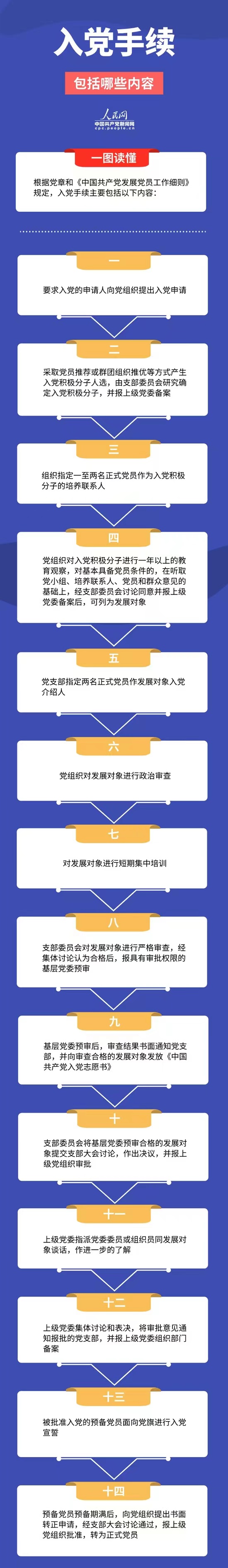 根據(jù)黨章和《中國共產(chǎn)黨發(fā)展黨員工作細則》規(guī)定,入黨手續(xù)主要包括以下內容: