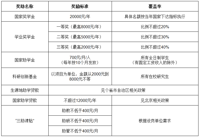 根據(jù)北京市財(cái)政局、北京市教育委員會(huì)制定的《北京市研究生國(guó)家獎(jiǎng)學(xué)金、學(xué)業(yè)獎(jiǎng)學(xué)金、國(guó)家助學(xué)金管理暫行辦法》,我校研究生設(shè)置有國(guó)家獎(jiǎng)學(xué)金、學(xué)業(yè)獎(jiǎng)學(xué)金和助學(xué)金,國(guó)家獎(jiǎng)學(xué)金和學(xué)業(yè)獎(jiǎng)學(xué)金按照獎(jiǎng)學(xué)金評(píng)選辦法進(jìn)行評(píng)選,助學(xué)金面向非定向?qū)W生。同時(shí),學(xué)校設(shè)置研究生“三助”崗位,為研究生提供勤工助學(xué)機(jī)會(huì)。