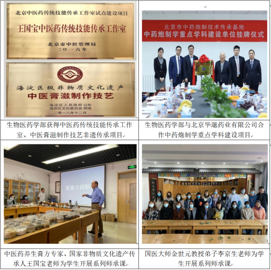 北京市中醫管理局2014年認定我校生物醫藥學部為“首都中藥師承教育學科基地”;2016年建立《王國寶中醫藥傳統技能傳承工作室》;2018年“中醫藥膏方制作技藝”獲得海淀區文化局批準;我校還與中國藥材公司下屬飲片企業華邈藥業共同開展北京中藥炮制重點學科建設工作,開展相關京幫炮制特色品種的工藝與質量標準研究。中醫藥傳承發展有關項目既是市政府對行業發展的支持與指導,也是行業人才培養的方向和要求。MCMM中心在研究生中藥傳統技能訓練方面,由師承導師以定制課形式開展傳承教學與實踐;在科研創新能力培養上,除參與科研課題訓練,還與中國中藥公司、中國中醫研究院、北京市科學技術研究院等企業和研究院開展聯合培養,在藥物新制劑、新功能或新活性發現等應用型研究領域形成穩定的、擁有豐富實踐經驗的行業專家和導師培養指導隊伍,形成學生科研思維和創新能力訓練的開放式訓練平臺。
