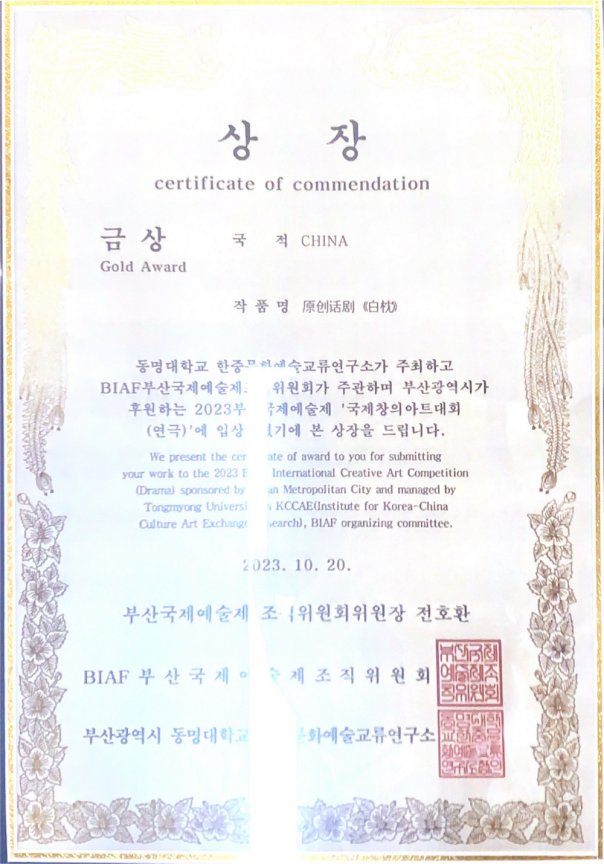 原創(chuàng)話劇《白枕》獲得釜山國(guó)際藝術(shù)節(jié)全球總決賽金獎(jiǎng)