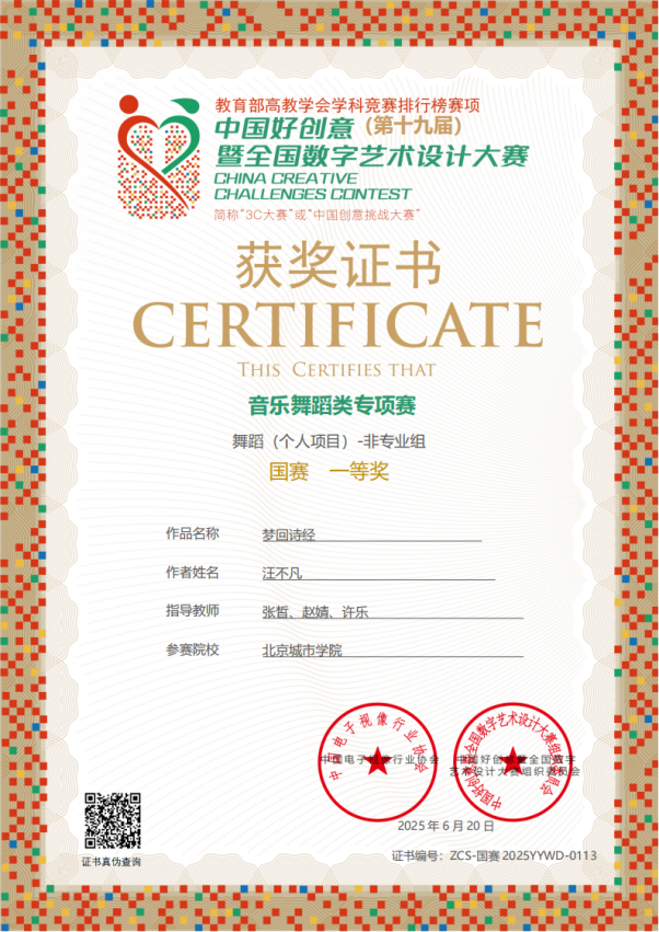 原創(chuàng)舞蹈作品《夢(mèng)回詩(shī)經(jīng)》榮獲中國(guó)好創(chuàng)意(第十九屆)暨全國(guó)數(shù)字藝術(shù)設(shè)計(jì)大賽音樂(lè)舞蹈類專項(xiàng)賽國(guó)賽一等獎(jiǎng)