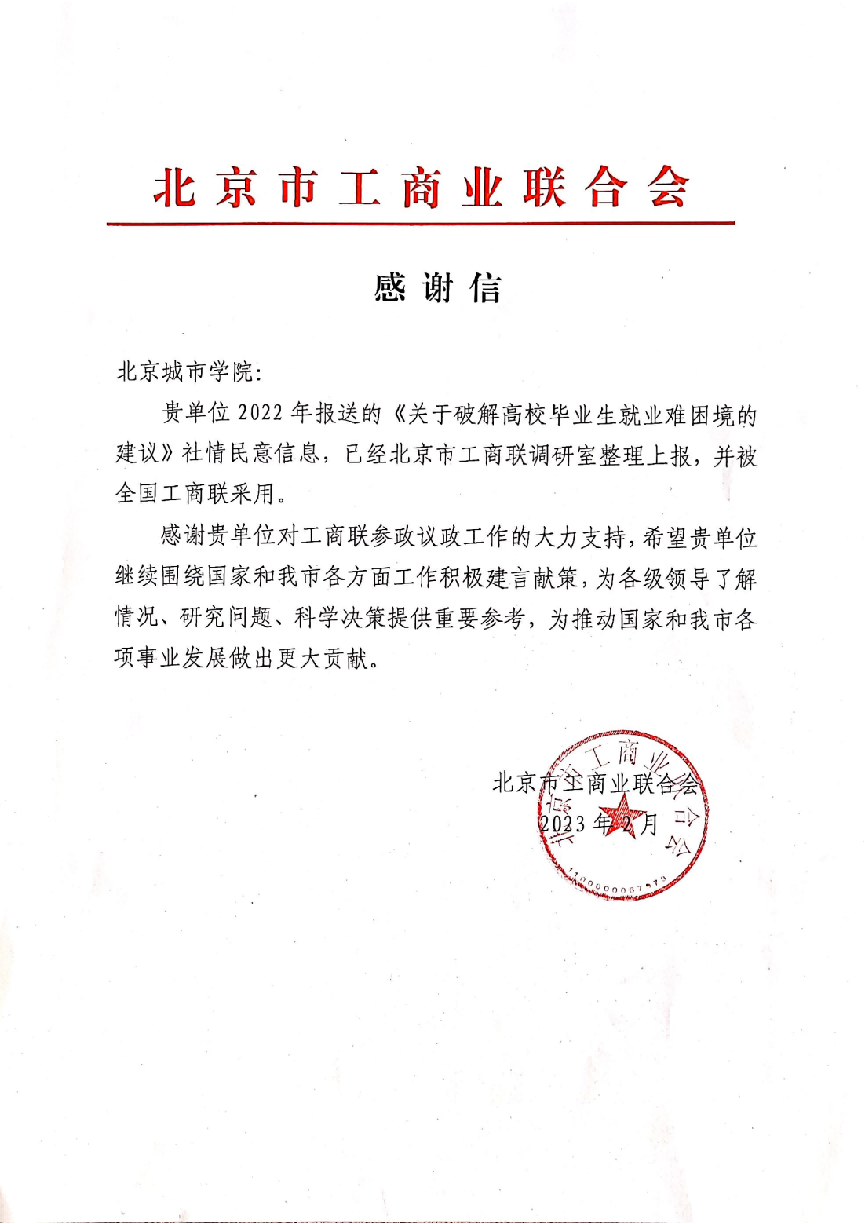 近日,我校收到北京市工商聯發來的感謝信。我校眾城智庫李達老師提交的科研成果《關于破解高校畢業生就業難困境的建議》社情民意信息,被北京市工商聯調研室整理上報,并被全國工商聯采用。