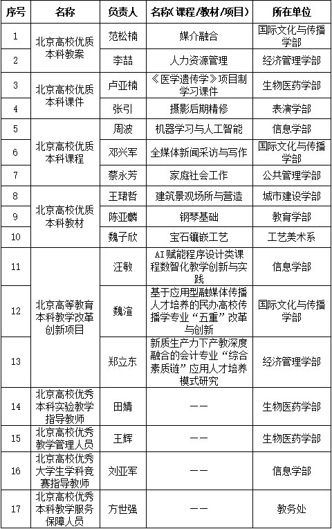 近日,北京市教育委員會(huì)公布2024年北京高校本科教學(xué)項(xiàng)目建設(shè)評(píng)選結(jié)果,我校17個(gè)項(xiàng)目入選北京高校優(yōu)質(zhì)本科教案課件、北京高校優(yōu)質(zhì)本科課程、北京高校優(yōu)質(zhì)本科教材等項(xiàng)目。