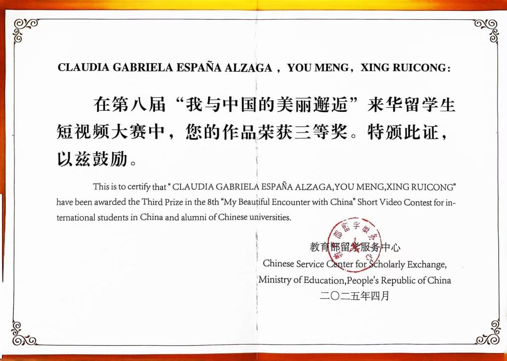 本次大賽中,我校榮獲“院校優(yōu)秀組織獎”,國際合作辦公室王立堅老師獲“優(yōu)秀指導教師”稱號,留學生Claudia Gabriela Espa?a Alzaga、西班牙語專業(yè)學生游萌、邢瑞驄的作品獲得短視頻大賽“三等獎”,留學生Andrea Fernanda Reyes Lechuga,Cortés García Kevin Elihel,I?IGO ZURITA GONZáLEZ,Rubens Alejandro Barros Sanchez和廣播電視編導專業(yè)學生俞滿意的作品獲得短視頻大賽“優(yōu)秀獎”。