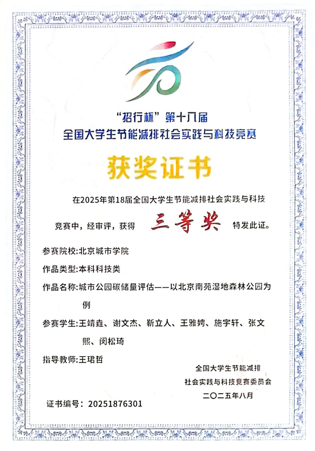 該團隊學生來自城市建設學部風景園林專業、地理信息科學專業以及信息學部人工智能專業、數據科學與大數據技術專業。他們積極關注北京城市建設熱點問題,通過科學測算、量化評估,圍繞南苑濕地森林公園這一北京南部地區重要的生態空間進行了碳儲量分析,為低碳城市規劃與生態建設提供了數據支撐,具有現實意義。該成果展現了我校風景園林生態研究的探索,也充分體現出我校跨學部、跨專業學生培養的積極效能。