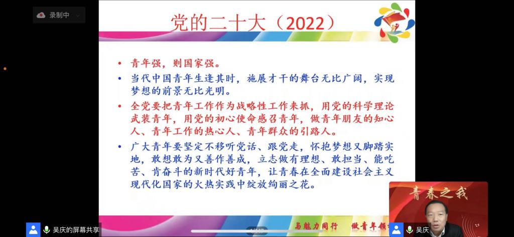 11月28日,我校邀請中央團校教授吳慶以“學習貫徹黨的二十大精神 推動新時代中國青年新發展”為主題作線上輔導報告。黨委副書記、副校長秦士友主持報告會,師生黨員共計400余人參加學習。