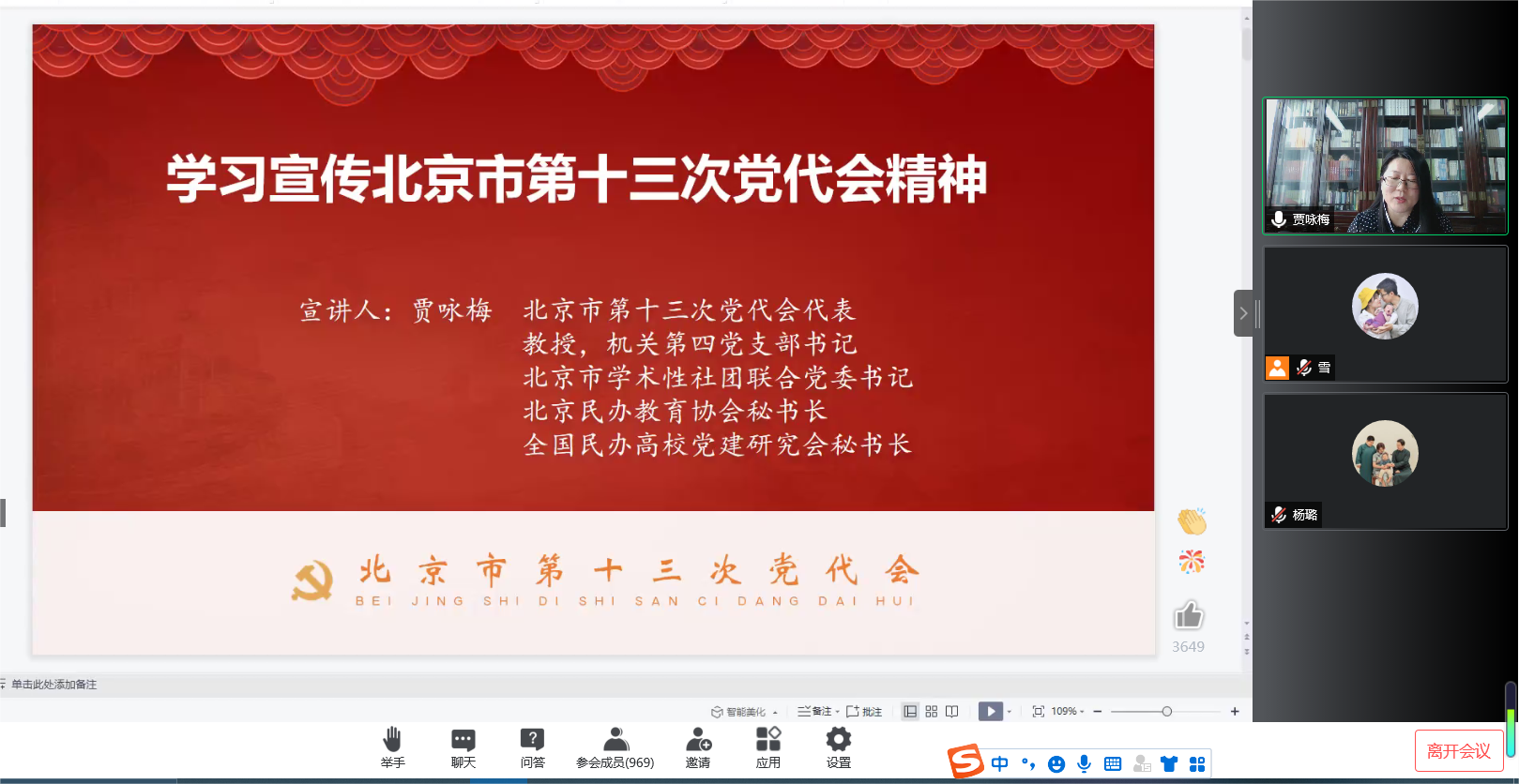 會上,賈詠梅教授從自身的參會感受談起,通過眾多鮮活事例,生動講解了黨代會的基本情況和首都過去五年的成績,黨代會對推動新時代首都發展、力爭率先基本實現社會主義現代化作出的全面部署,以及黨代會對推進全面從嚴治黨提出的明確要求。整場報告政治站位高,主題鮮明,邏輯清晰,重點突出,對大會精神作了很好的闡釋,對師生今后深入學習貫徹北京市第十三次黨代會精神有很強的啟發和指導作用。