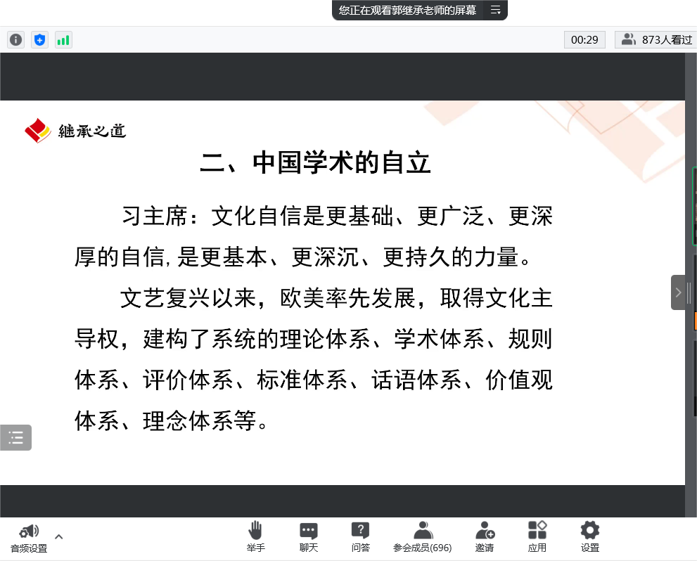 6月24日,我校聯(lián)合市社科院(市委講師團(tuán)),邀請中國政法大學(xué)副教授郭繼承通過騰訊會議作“堅(jiān)定文化自信,增強(qiáng)做中國人的底氣和骨氣”專題報(bào)告。師生近千人線上參加學(xué)習(xí)。
