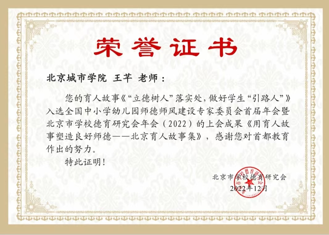 在近日召開(kāi)的全國(guó)中小學(xué)幼兒園師德師風(fēng)建設(shè)專家委員會(huì)首屆年會(huì)暨北京市學(xué)校德育研究會(huì)年會(huì)(2022)上,《用育人故事塑造良好師德——北京育人故事集》作為大會(huì)推薦典型案例進(jìn)行了展示與交流。由我校黨委教師工作部推薦、表演學(xué)部學(xué)工辦主任王芊老師撰寫的管理育人案例——《“立德樹(shù)人”落實(shí)處,做好學(xué)生“引路人”》入選該育人故事集。