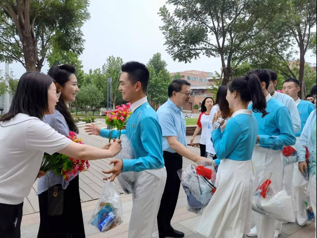 同學們從慶祝大會凱旋回校時,校黨委副書記、副校長秦士友,黨委宣傳部、學工委、表演學部、校團委等相關部門負責人帶領所有參訓學生的輔導員們一起在潮白講堂門口為光榮返校的參訓師生準備了簡短而熱烈的迎接儀式。合唱團的同學們自發唱起了《唱支山歌給黨聽》《新的天地》等歌曲,將在廣場上的激動心情第一時間傳遞給了在校師生。