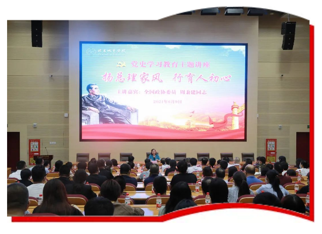 為慶祝中國共產黨建黨100周年,謳歌黨的輝煌歷程和豐功偉績,深入學好黨史、新中國史、改革開放史、社會主義發展史,進一步發揚和繼承老一輩革命家革命傳統和優良作風,激發黨員干部和師生愛黨愛國愛社會主義的熱情,中共順義區人大常委會黨組、中共順義區人大常委會機關黨總支、中共北京城市學院委員會于6月9日下午在順義校區聯合開展學習活動,邀請第十一屆、十二屆、十三屆全國政協委員、周恩來總理的侄女周秉建同志作“揚總理家風,行育人初心”黨史學習教育專題報告。