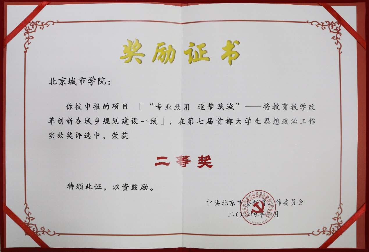 近日,由市委教育工委組織開展的第七屆首都大學(xué)生思想政治工作實(shí)效獎(jiǎng)評(píng)選結(jié)果揭曉,經(jīng)材料審核、專家初評(píng)、交流展示等環(huán)節(jié),我校申報(bào)的項(xiàng)目“‘專業(yè)致用 逐夢(mèng)筑城’——將教育教學(xué)改革創(chuàng)新在城鄉(xiāng)規(guī)劃建設(shè)一線”榮獲二等獎(jiǎng)。