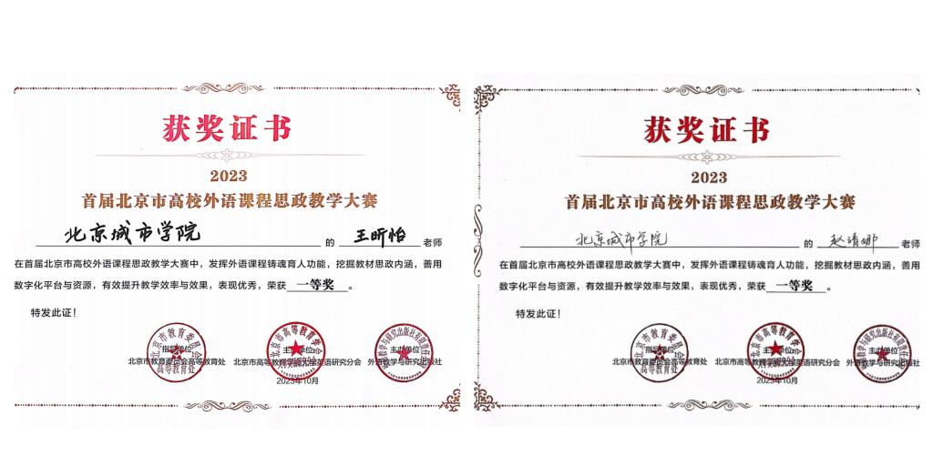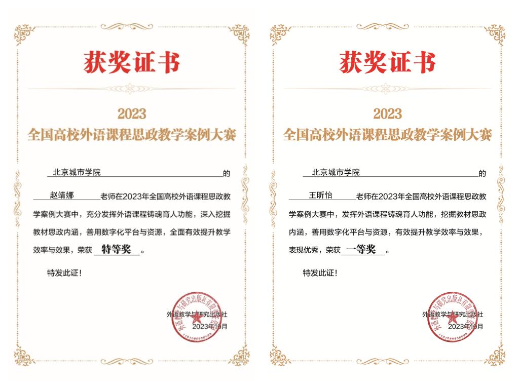 此前,在8月份舉辦的2023年全國高校外語課程思政教學案例大賽中,趙靖娜老師獲得特等獎,王昕怡老師獲得一等獎。