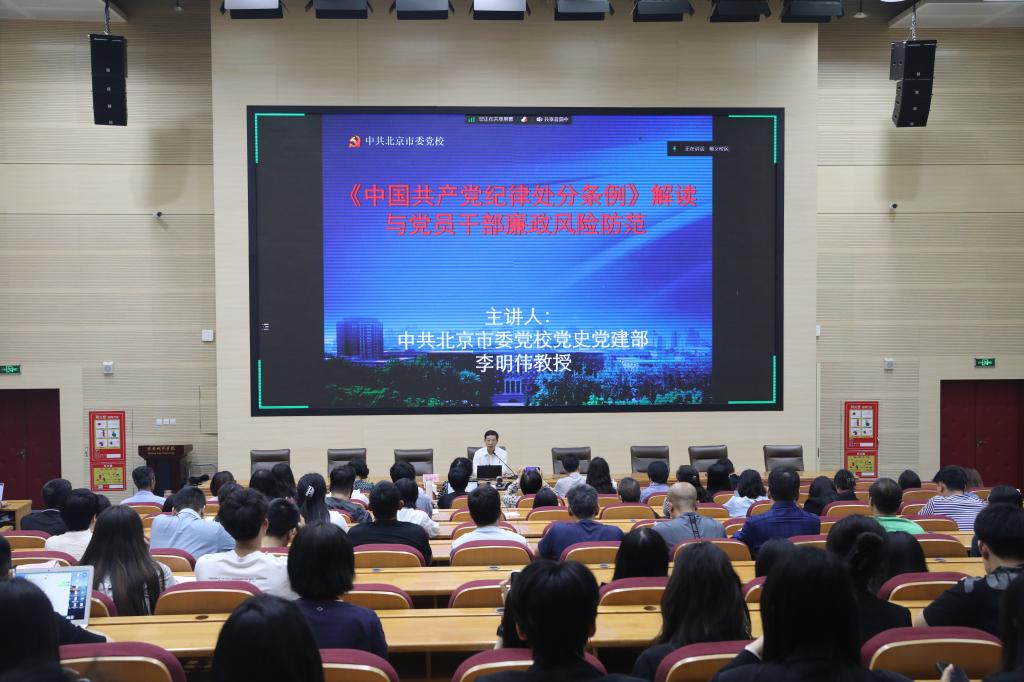 為深入開展黨性、黨風、黨紀教育,5月23日,我校聯合市社科院(市委講師團),邀請中共北京市委黨校黨史黨建部李明偉教授開展《中國共產黨紀律處分條例》(以下簡稱《條例》)解讀專題報告會,校領導、各基層黨組織師生代表在順義校區主會場、航天城校區分會場及線上參加學習。