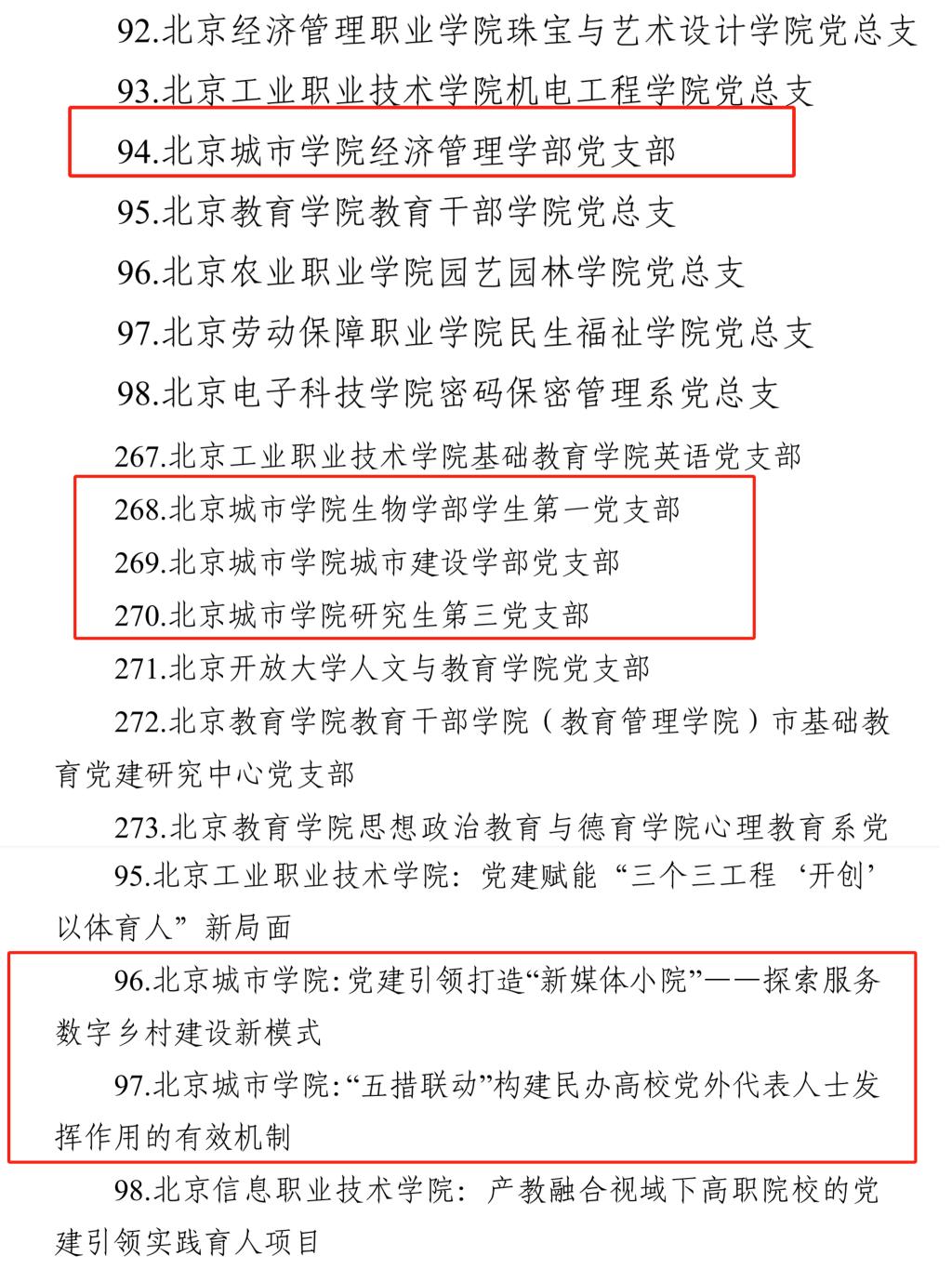 近日,市委教育工委公布了北京高校黨建工作“標(biāo)桿院系”“樣板支部”“黨建引領(lǐng)實(shí)踐創(chuàng)新示范項(xiàng)目”培育創(chuàng)建單位名單,經(jīng)高校推薦、專家評(píng)審、市委教育工委委員會(huì)議審議、結(jié)果公示等環(huán)節(jié),遴選產(chǎn)生了 100 個(gè)北京高校黨建工作“標(biāo)桿院系”、300 個(gè)北京高校黨建工作“樣板支部”和 100 個(gè)“黨建引領(lǐng)實(shí)踐創(chuàng)新示范項(xiàng)目”。我校共入選6項(xiàng),其中,經(jīng)濟(jì)管理學(xué)部黨支部入選北京高校黨建“標(biāo)桿院系”培育創(chuàng)建單位;生物學(xué)部學(xué)生第一黨支部、城市建設(shè)學(xué)部黨支部、研究生第三黨支部入選北京高校黨建“樣板支部”培育創(chuàng)建單位;黨委統(tǒng)戰(zhàn)部申報(bào)的“五措聯(lián)動(dòng)”構(gòu)建民辦高校黨外代表人士發(fā)揮作用的有效機(jī)制”項(xiàng)目、表演學(xué)部與表演學(xué)部學(xué)管第一黨支部聯(lián)合申報(bào)的“黨建引領(lǐng)打造‘新媒體小院’——探索服務(wù)數(shù)字鄉(xiāng)村建設(shè)新模式”項(xiàng)目入選“黨建引領(lǐng)實(shí)踐創(chuàng)新示范項(xiàng)目”培育創(chuàng)建單位。此次,我校入選的黨建培育創(chuàng)建項(xiàng)目種類(lèi)全、數(shù)量多,其中在“標(biāo)桿院系”和學(xué)生“樣板支部”兩個(gè)黨建“雙創(chuàng)”項(xiàng)目類(lèi)別上實(shí)現(xiàn)了新突破。