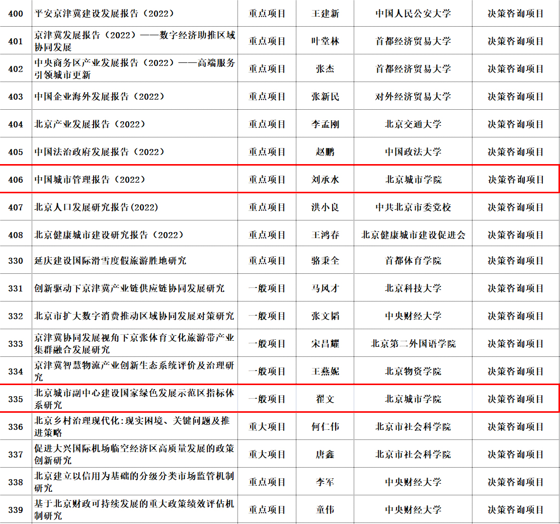 近日,北京市社科聯、北京市社科規劃辦公布了2021年度北京市社會科學基金立項項目名單,我校首都城市環境建設研究基地申報的2項課題成功通過,分別是基地首席專家劉承水教授申請的重點項目《中國城市管理報告2022》和翟文老師申請的一般項目《北京城市副中心建設國家綠色發展示范區指標體系研究》。以上兩個項目皆屬于決策咨詢項目,研究內容是城市治理、社會治理、環境治理等領域及方向。
