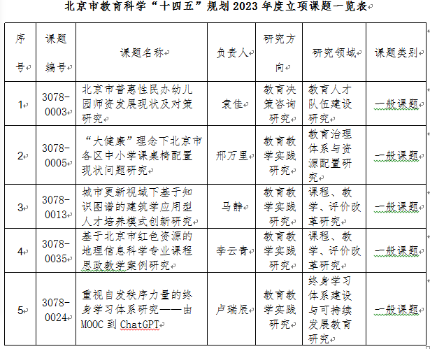 近日,經北京市教育科學規劃領導小組審批,我校喜獲北京市教育科學“十四五”規劃2023年度課題立項5項。立項項目名單如下。