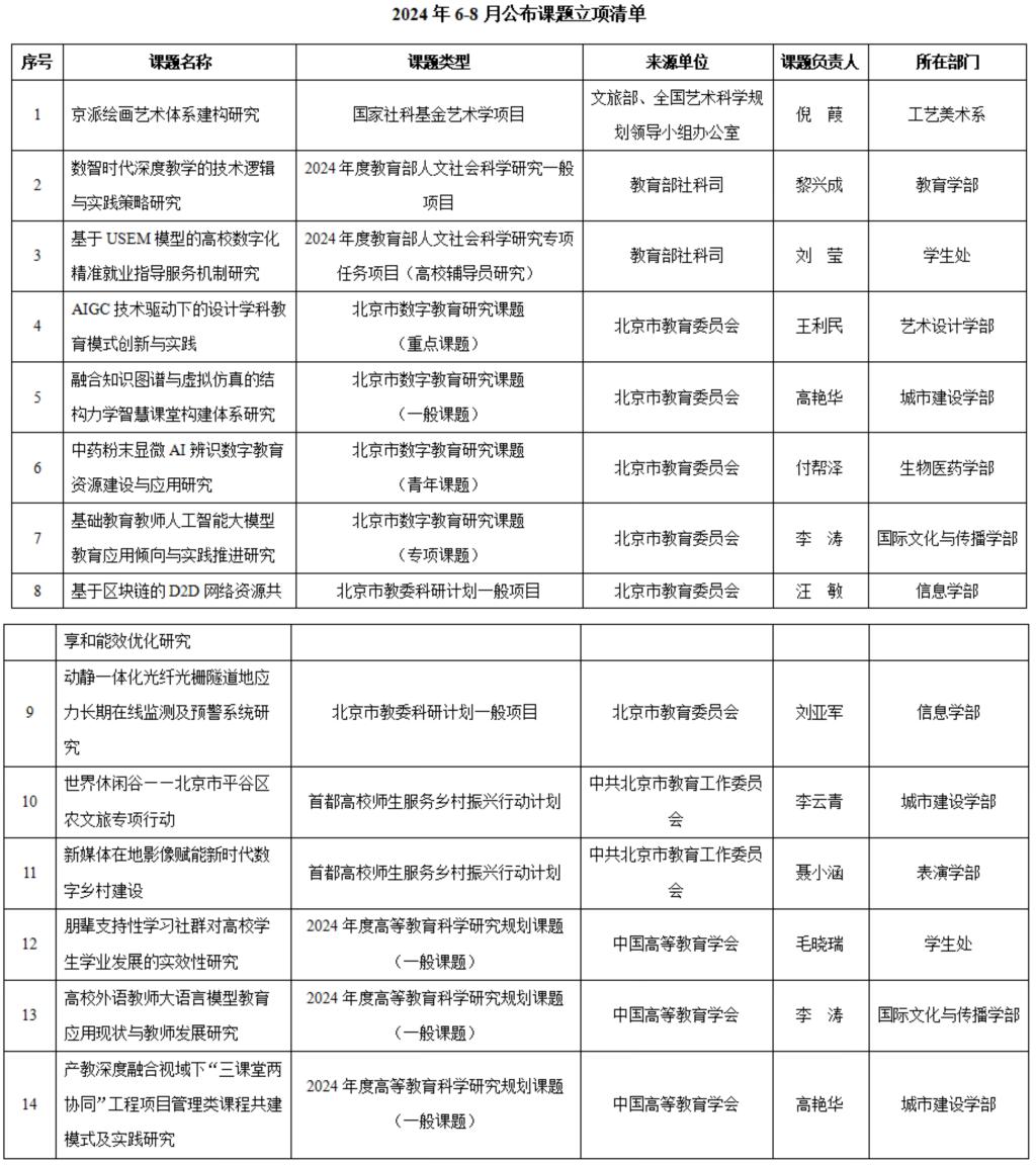 在近期公布的課題立項公告里,我校教師獲得國家社科基金藝術學項目、教育部人文社科研究項目、北京市數字教育研究課題、北京市教委科研計劃一般項目、首都高校師生服務鄉村振興行動計劃項目等14項立項。課題組教師將認真做好課題研究工作,取得高質量研究成果。立項課題如下: