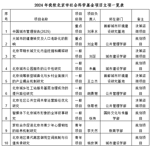 近日,北京市社科聯、北京市社科規劃辦公布了2024年北京市社會科學基金項目評審結果,我校獲批10項北京市社會科學基金項目,其中重點項目2項,一般項目6項,青年項目2項,立項數量創歷年新高,為我校科研工作再添光彩。立項項目名單如下。