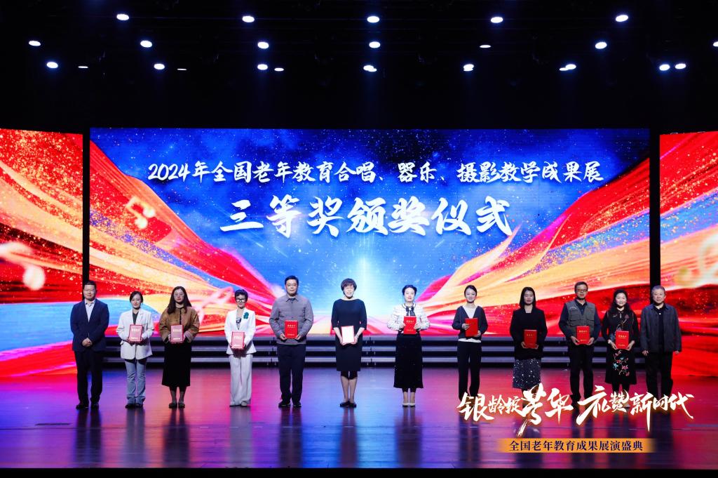 通過持續深耕街校融合,老年大學收獲碩果。老年大學指導并推薦學院路街道合唱、舞蹈、器樂、書畫和攝影等文藝社團參與國家老年大學和北京老年開放大學的展演和比賽,屢獲佳績。在2024年國家老年大學教育成果展中,器樂節目《壯志飛揚》榮獲二等獎和優秀指導教師獎;大合唱節目《黃水謠》榮獲三等獎和優秀指導教師獎;舞蹈節目《希格希日》榮獲優秀獎。在“熠·京秋”第三屆北京老年教育文化藝術節中,原創管樂合奏《壯志飛揚》榮獲一等獎,民樂合奏《鄉村振興曲》榮獲二等獎,6幅書畫作品參加線上云展播。這些榮譽不僅彰顯了我校老年教育的實力,更鼓舞了老年人積極參與學習與展示的熱情。