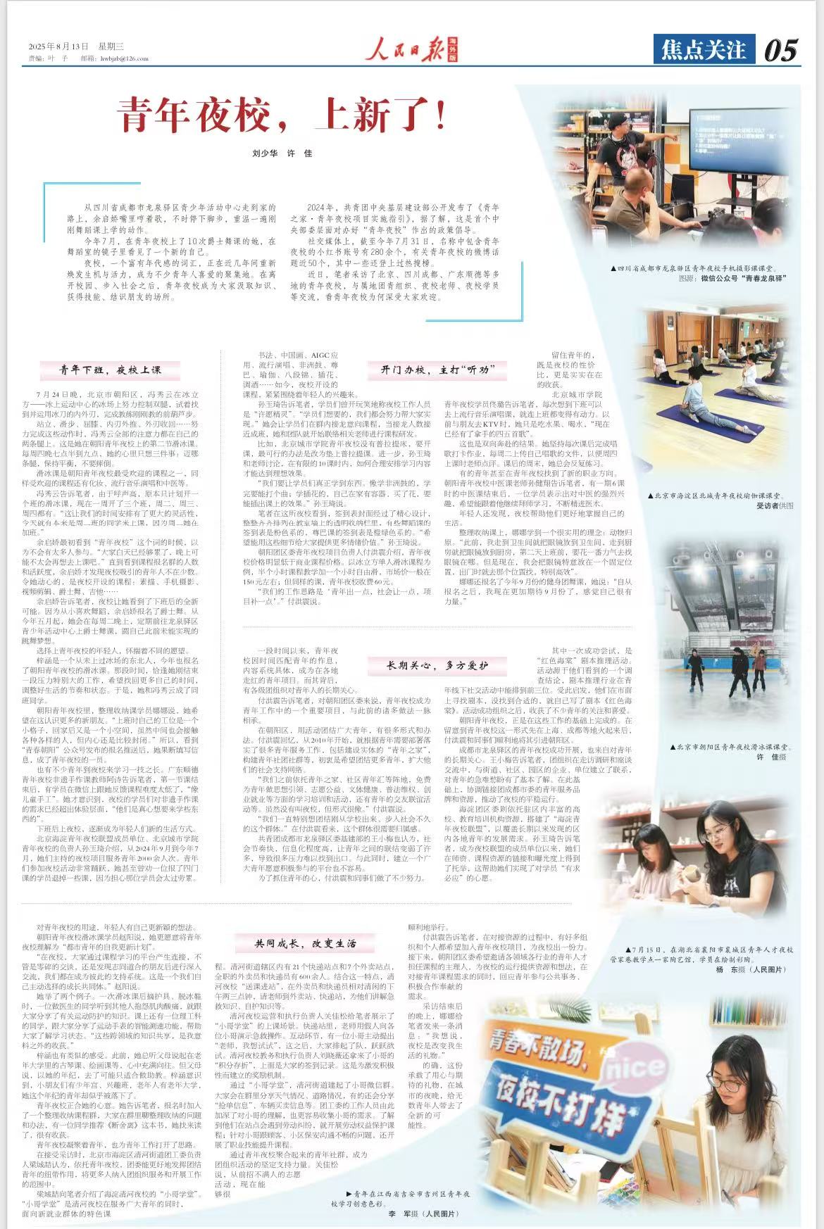 8月13日,我校青年夜校作為全國青年教育創新標桿案例,被《人民日報海外版》以《青年夜校,上新了!》為題進行專題報道。報道聚焦我校青年夜校在課程創新、資源整合與青年服務方面的突出成果,特別強調其“低門檻、高質量、強鏈接”的辦學特色,以及通過國際化視角推動青年全面發展的實踐經驗。