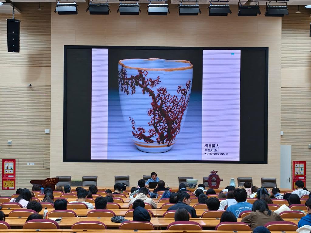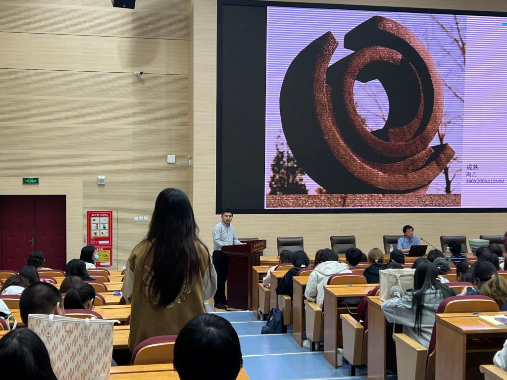 講座中,陳烈漢大師以其深厚的學術造詣與卓越的藝術成就,將個人的藝術探索之旅娓娓道來。他深刻剖析了傳統陶瓷與現代設計之間的精妙融合,揭示了工藝技術與藝術靈感如何在新時代碰撞出創新的火花,并通過一系列精心挑選的作品展示,生動展現了他在陶瓷藝術領域中的題材創新、造型突破、材料探索及工藝革新,為在場的師生開啟了一扇通往藝術鑒賞新高度的窗口。