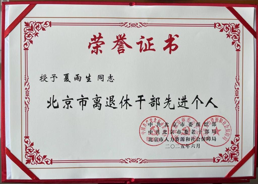 6月25日,北京市離退休干部慶祝中國(guó)共產(chǎn)黨成立104周年“雙先”表彰會(huì)在北京會(huì)議中心召開。會(huì)上共表彰了100個(gè)離退休干部先進(jìn)集體、200名離退休干部先進(jìn)個(gè)人和60個(gè)老干部工作先進(jìn)集體、100名老干部工作先進(jìn)個(gè)人。其中表彰教育系統(tǒng)離退休干部先進(jìn)集體7個(gè)、先進(jìn)個(gè)人20名。我校退休教師夏雨生榮獲“北京市離退休干部先進(jìn)個(gè)人”稱號(hào)。