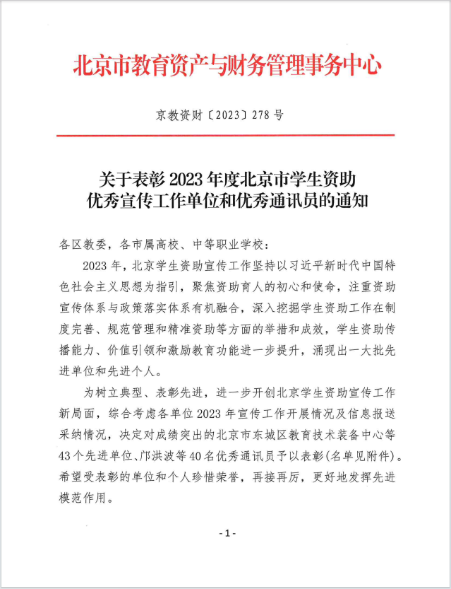 近日,北京市教育資產與財務管理事務中心組織開展了2023年度北京市學生資助優秀宣傳工作單位評選,我校喜獲“2023年度北京市學生資助優秀宣傳工作單位”榮譽稱號。