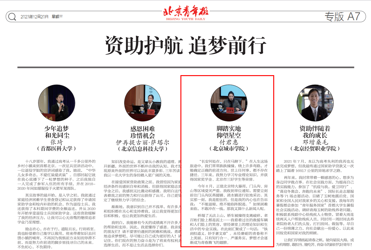 近年來,學校資助工作嚴格落實立德樹人根本任務,聚焦資助育人的初心和使命,注重資助宣傳體系與政策落實體系有機融合,不斷提升學生資助工作宣傳力度和育人成效。為了加大宣傳力度,使學生了解資助政策,學校設計資助政策簡介彩頁隨錄取通知書一起寄送給新生,在注冊報到現場設立“綠色通道”,為家庭經濟困難學生解答政策,幫助他們順利入學。同時,學生也可在“北城學工”公眾號隨時查詢各項資助工作流程導圖及常見問題答疑等。為了提升育人成效,“北城學工”公眾號開設“橙榜樣”勵志學子專欄,在電子屏進行勵志學子風采展示,指導學生以勵志事跡為原型拍攝《奮斗》《榜樣》等微電影,組織獲國家獎學金、國家勵志獎學金等的優秀學生擔任“學生資助宣傳大使”,從而營造良好的榜樣氛圍。我校優秀學生事跡也被北京日報、北京晚報、北京青年報等多家媒體報道,2023年我校推薦的5名學生全部入選“北京市學生資助宣傳大使”。
