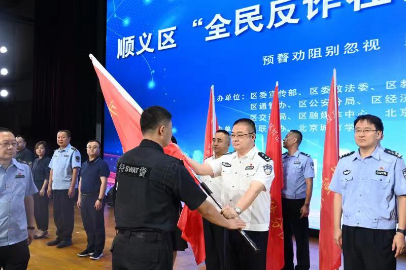 活動中,全體與會人員觀看電信網絡詐騙十大高發類案介紹和順義區反詐宣傳短劇《破詐》。順義區副區長、公安分局黨委書記、局長楊大勝為區級專業反詐宣傳隊和9家專業反詐宣傳分隊進行授旗,并發布全民反詐動員令。