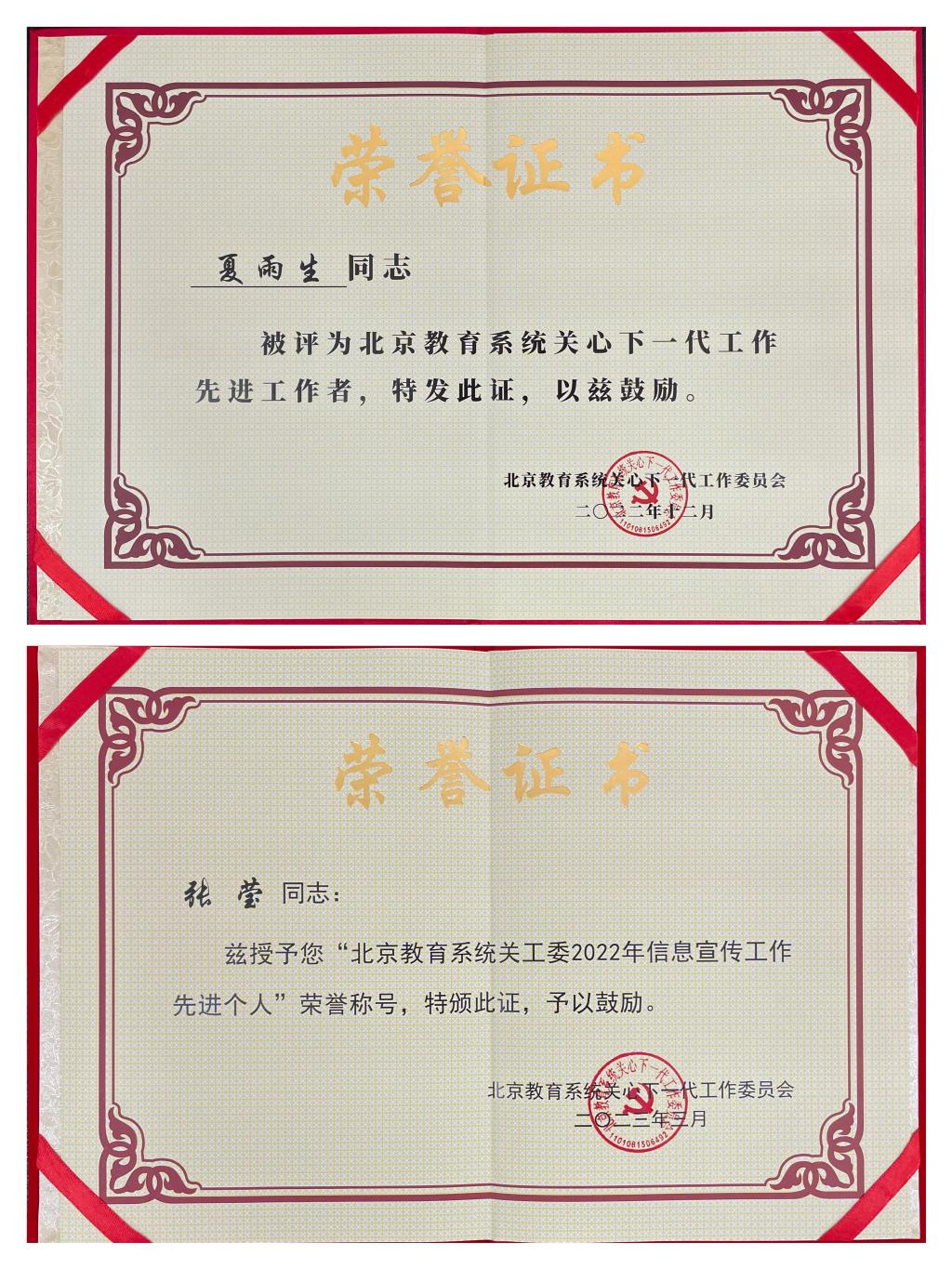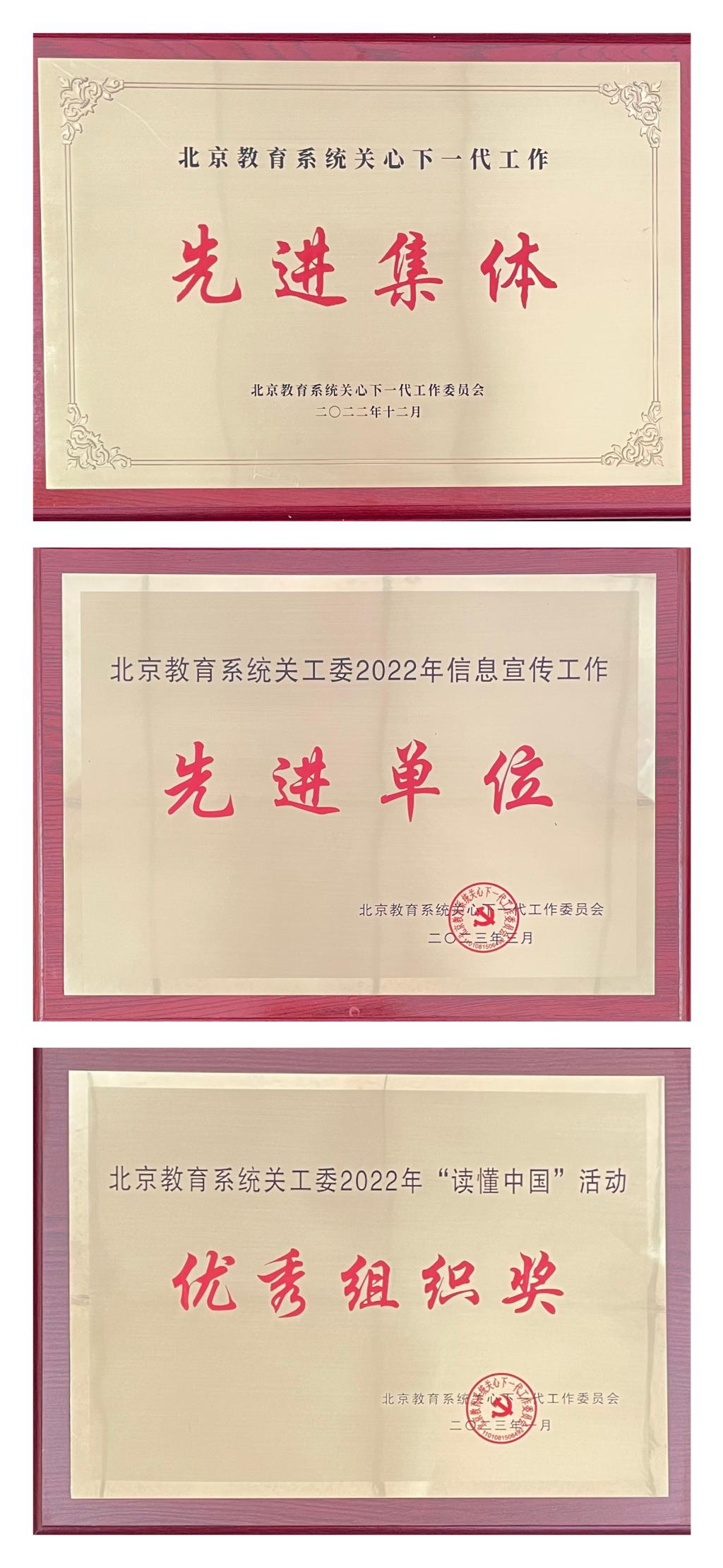會(huì)議期間,對(duì)2022年關(guān)工委工作進(jìn)行了總結(jié)表彰。我校關(guān)工委獲“北京教育系統(tǒng)關(guān)心下一代工作先進(jìn)集體”“北京教育系統(tǒng)關(guān)工委2022年信息宣傳工作先進(jìn)單位”榮譽(yù)稱號(hào)及北京教育系統(tǒng)關(guān)工委2022年“讀懂中國(guó)”活動(dòng)優(yōu)秀組織獎(jiǎng),校關(guān)工委副主任夏雨生獲“北京教育系統(tǒng)關(guān)心下一代工作先進(jìn)工作者”榮譽(yù)稱號(hào),校關(guān)工委秘書(shū)長(zhǎng)張瑩獲“北京教育系統(tǒng)關(guān)工委信息宣傳工作先進(jìn)個(gè)人”榮譽(yù)稱號(hào)。在“讀懂中國(guó)”活動(dòng)中,校關(guān)工委推送的征文《我們創(chuàng)作要有中國(guó)獨(dú)有的東西——記三大郵票設(shè)計(jì)大師北京城市學(xué)院魏惠筠教授》獲征文一等獎(jiǎng),《為教育甘做“拓荒人”——與重走長(zhǎng)征路的北京城市學(xué)院夏雨生教授共話百年黨史》獲征文三等獎(jiǎng),推送的微視頻《郵票匠人魏惠筠教授》獲微視頻一等獎(jiǎng)。