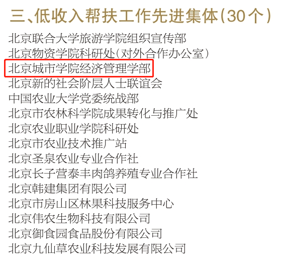 近日,中共北京市委農村工作領導小組辦公室、中共北京市委農村工作委員會、北京市農業農村局、北京市鄉村振興局、北京市人力資源和社會保障局公布北京農村工作先進集體和先進個人(2017-2021年)名單,我校經濟管理學部同中國農業大學黨委統戰部等五所大學的相關部門作為高校代表一同獲得“低收入幫扶工作先進集體”稱號。