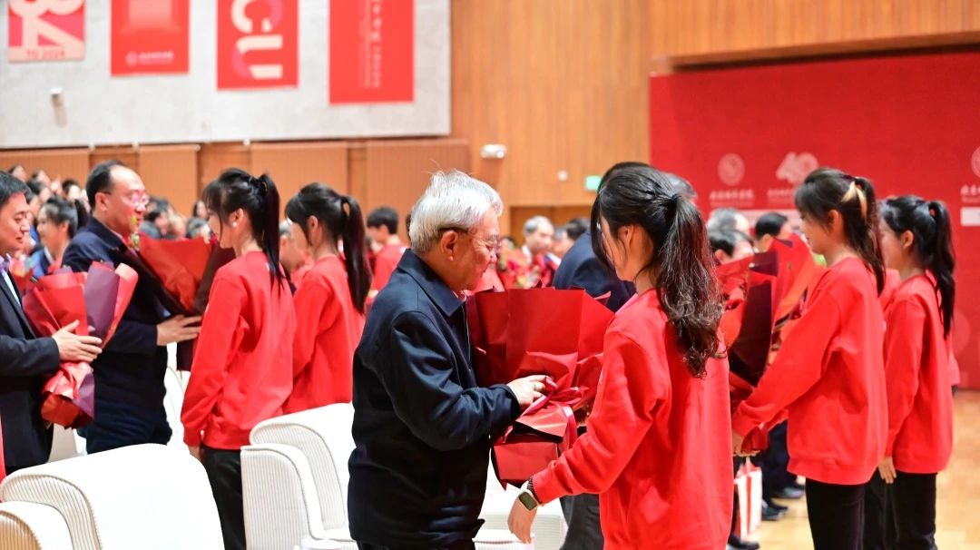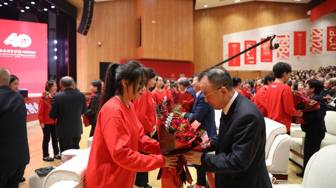 大會上,師生代表共同表演原創情景朗誦《傳“城”》,禮贊學校40年初心不改、篤行彌堅。屏幕上一幅幅老照片和老領導、老教師等熟悉面孔激起了大家對過去歲月的溫暖回憶;激情的朗誦讓青春的活力在會場中飛揚。學生代表向給予學校關心、支持的各位嘉賓獻上鮮花,致敬他們情系教育、無私支持。
