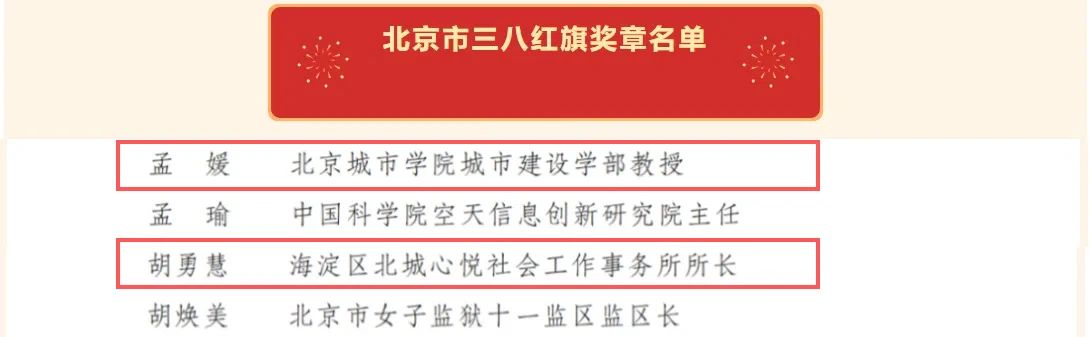 近日,北京市三八紅旗獎章、北京市三八紅旗集體全名單公布。我校城市建設學部主任孟媛、公共管理學部主任胡勇慧(社會組織領域代表)被授予“北京市三八紅旗獎章”稱號。