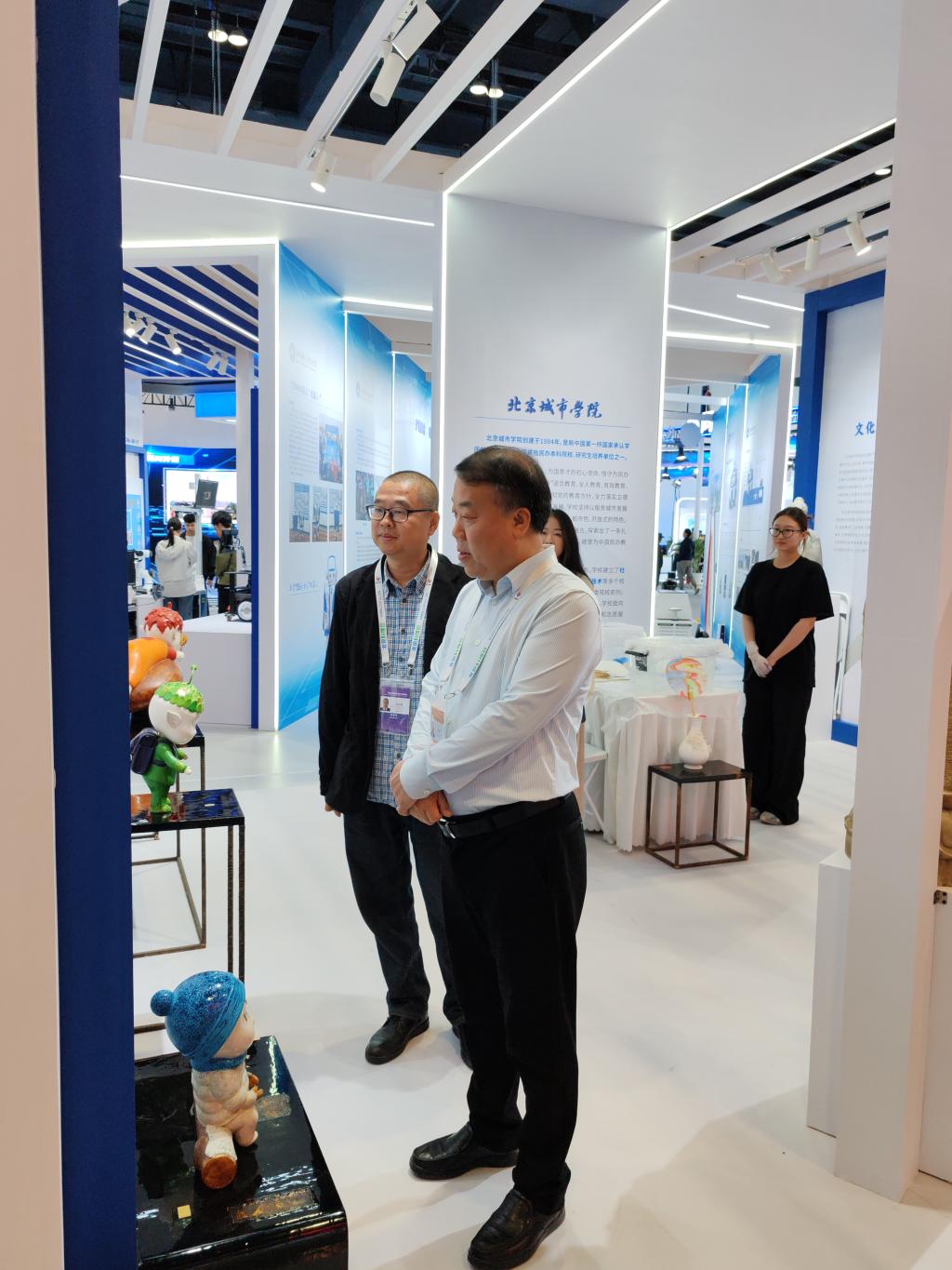展覽期間,中華職業教育社副總干事彭嶺果,北京市委統戰部副部長張健,北京市委統戰部二級巡視員、北京市中華職業教育社秘書長趙寧康蒞臨我校展區指導工作,對學校在文物數字化領域取得的成績給予高度評價。校長劉林在展區聽取文化遺產學部主任陳秋榮教授的詳細匯報后,充分肯定了學部在文化遺產保護領域的實踐,并對學部文脈傳承、科技創新相關工作進一步提出要求。